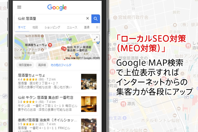 現在みなさんもご存知のように、パソコンやスマートフォンでGoogle検索してみると、写真のようにMAPが表示されるのを見たことがあると思います。通常のSEO領域よりも上位を占める割合が高く、目につく場所に表示されます。さらに、iPhoneやAndroidケータイなどのスマートフォンでは、PC以上の見やすさで表示されることが可能です。この対策が弊社では可能で、『居酒屋+地域』などで検索した場合、上位3つに表示されるような対策が可能です。こちらもご相談頂ければ、集客にも一役かってくれるのではないかと思います。