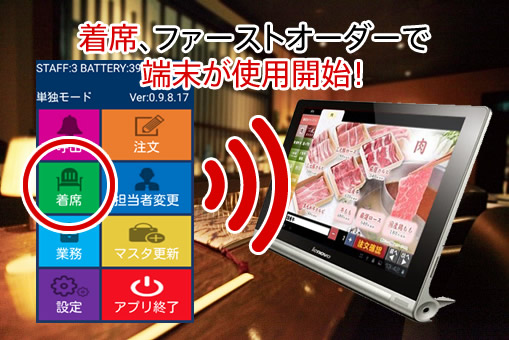 着席処理、またはファーストオーダーにより各テーブルのセルフオーダー端末が使用できます。