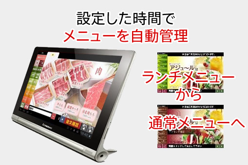 よく目にするレストランの「朝食限定」「ランチメニュー」「ディナーメニュー」などの時間帯で商品の入れ替えも、セルフオーダーを導入することにより、簡単操作で入替可能です。そのためテーブルのメニュー表を入れ替えする手間が省くことができ、ホールの清掃、仕込み、調理などに時間がかけれます。