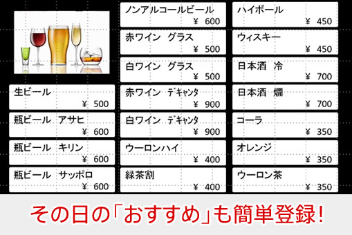 その日のおすすめメニューなどを、固定レイアウトに簡単に写真を取り込みメニュー設定ができます。