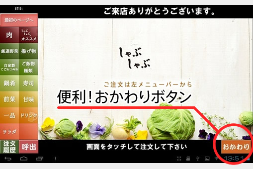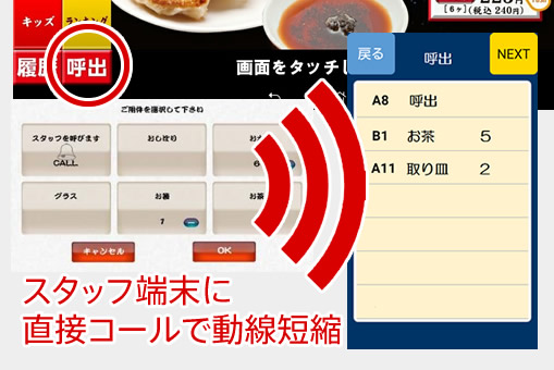 おかわりオーダー(履歴表示)でお客様が簡単(ワンタッチ)に同じメニューを注文する事が出来ます。