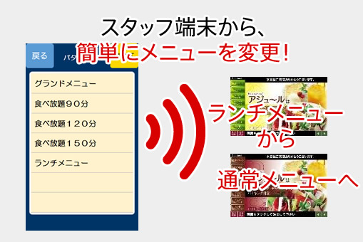 ハンディ端末またはステーション端末からランチ、ディナー、飲み放題メニューなどテーブル毎に簡単に切り替えができます。
