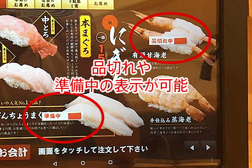 品切れ商品は、お客様がオーダーできなくなります。スタッフ端末で容易に設定でき、すぐに全端末に反映します。また解除も容易です。