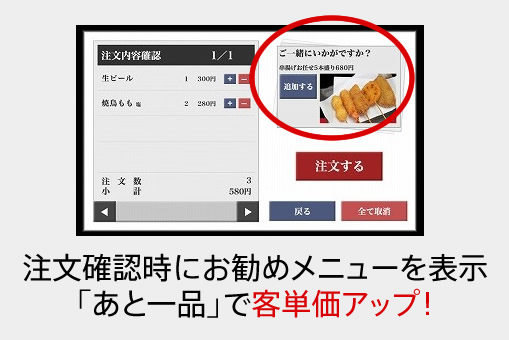 オーダー毎にあらかじめ登録をしたお勧めメューを表示してできます。また、オーダー毎に商品切り替えが可能。ベテラン従業員さんにも負けない自然なオーダー催促で“あと一品!”の追加オーダーがとれます。