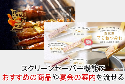 一定時間に端末操作がない場合に、静止画を流すことができます。宴会案内、店舗案内などの広告に活用ができます。(パターン毎に一枚設定可)